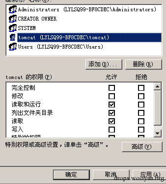 首先创建一个普通用户,为其设置密码,将其密码策略设置为“密码永不过期”,比如我们创建的用户为tomcat。然后修改tomcat安装文件夹的访问权限,为tomcat赋予Tomcat文件夹的读、写、执行的访问权限,赋予Tomcat对WebApps文件夹的只读访问权限,如果某些Web应用程序需要写访问权限,单独为其授予对那个文件夹的写访问权限。