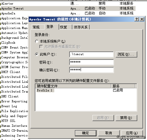 “开始→运行”,输入services.msc打开服务管理器,找到Apache Tomcat服务,双击打开该服务的属性,在其实属性窗口中点击“登录”选项卡,在登录身份下选中“以此帐户”,然后在文本框中输入tomcat和密码,最后“确定”并重启服务器。这样tomcat就以tomcat这个普通用户的权限运行。