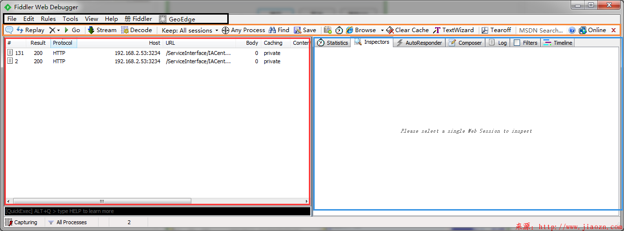 1、Fiddler菜单栏,上图黑色部分,包括捕获http请求,停止捕获请求,保存http请求,载入本地session、设置捕获规则等功能。