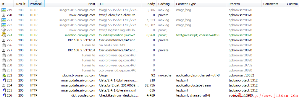 另外,注意请求的host字段。可以看到有来自多个www.csdn.net的子域名的响应,说明在大型网站的架构中,大多需要多个子域名,这些子域名可能是单独用于缓存静态资源的,也可能是专门负责媒体资源的,或者是专门负责数据统计的(如pingback)