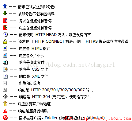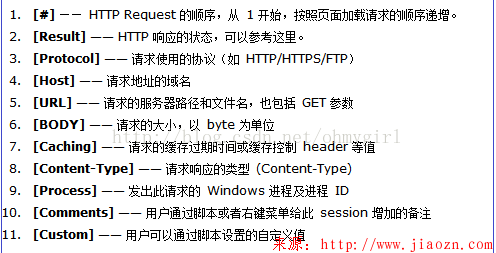 3、Web Session面板,上图红色部分,主要是Fiddler抓取到的每条http请求(每一条称为一个session),主要包含了请求的url,协议,状态码,body等信息,详细的字段含义如下图所示: