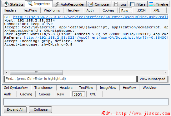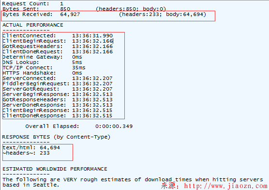 4、详情和数据统计板,针对每条http请求的具体统计(例如发送/接受字节数,发送/接收时间,还有粗略统计世界各地访问该服务器所花费的时间)和数据包分析。如inspector面板下,提供headers、textview、hexview,Raw等多种方式查看单条http请求的请求报文的信息: