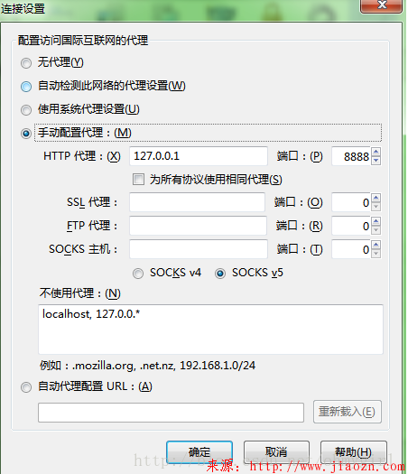 工具->选项->高级->网络->设置 。并配置相应的代理如下: