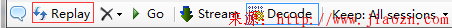 2、Fiddler的工具栏,上图黄色部分,包括Fiddler针对当前view的操作(暂停,清除session,decode模式、清除缓存等)。