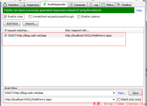 Fiddler比较重要且比较强大的功能之一。可用于拦截某一请求,并重定向到本地的资源,或者使用Fiddler的内置响应。可用于调试服务器端代码而无需修改服务器端的代码和配置,因为拦截和重定向后,实际上访问的是本地的文件或者得到的是Fiddler的内置响应。当勾选allow autoresponser 并设置相应的规则后(本例中的规则是将http://blog.csdn.net/aaa的请求拦截到本地的文件http://localhost:54321/WebForm1.aspx),如下图所示