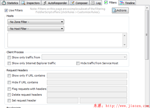 Filter标签则可以设置Fiddler的过滤规则,来达到过滤http请求的目的。最简单如:过滤内网http请求而只抓取internet的http请求,或则过滤相应域名的http请求。Fiddler的过滤器非常强大,可以过滤特定http状态码的请求,可以过滤特定请求类型的http请求(如css请求,image请求,js请求等),可以过滤请求报文大于或则小于指定大小(byte)的请求