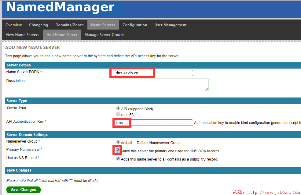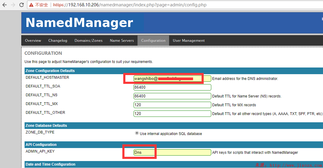 接着设置API key(如下图。设置邮箱地址和API key,这个key是在上面的/etc/namedmanager/config-bind.php文件中设置的)