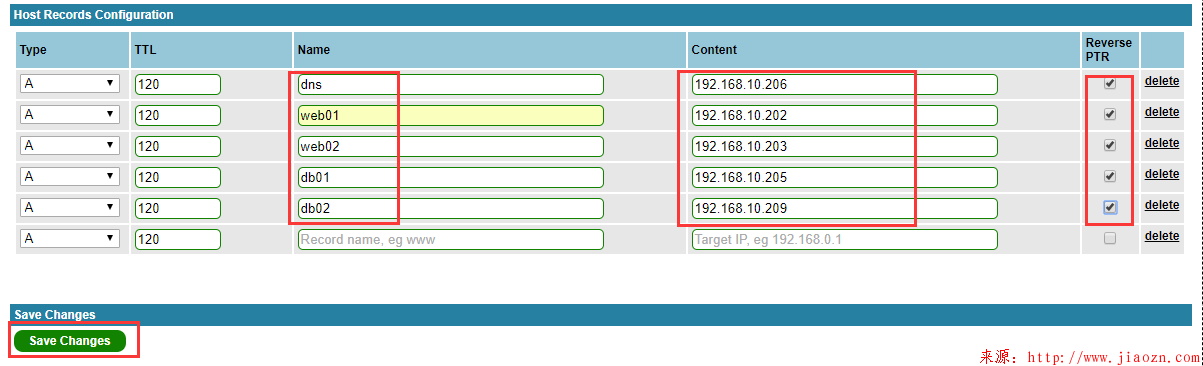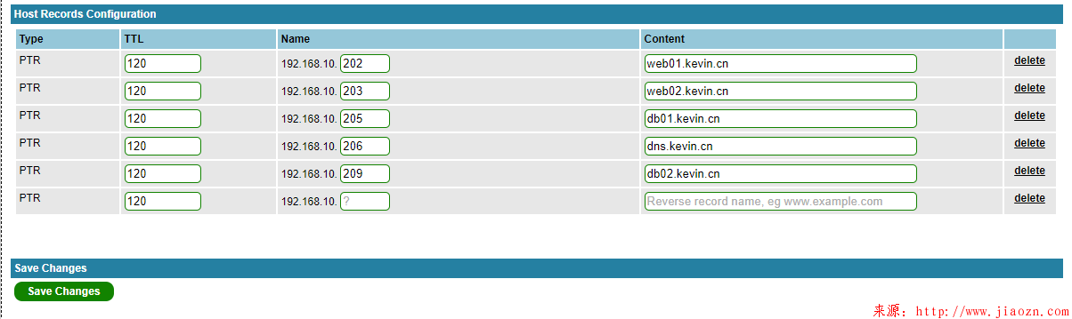 上面已经成功添加了正反向解析域名,现在尝试添加一些域名的A记录和PTR记录