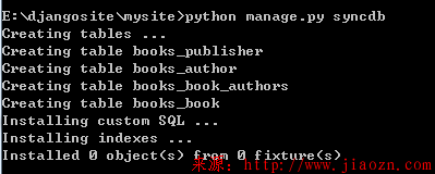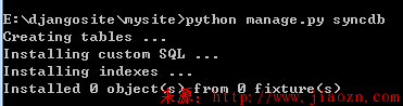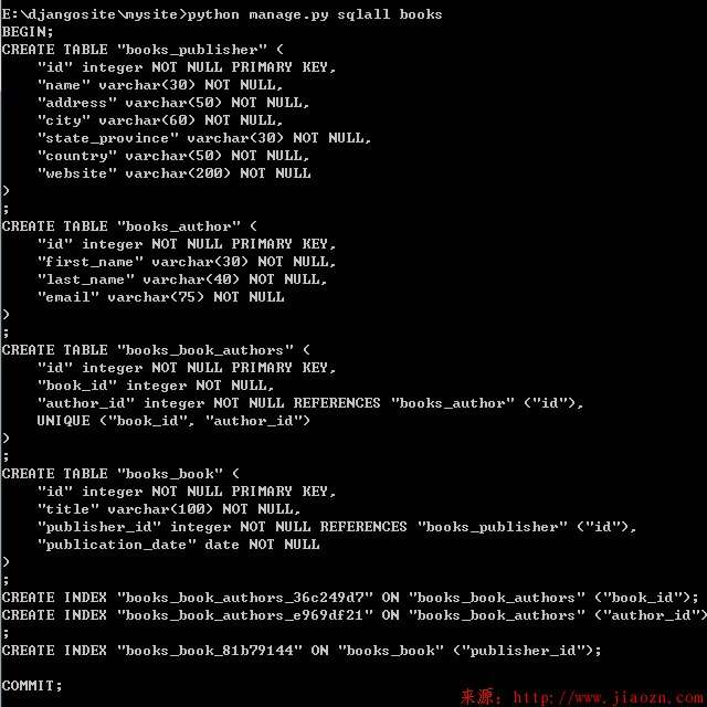 这就是models.py定义的数据模型对应的sql语句。sqlall 命令并没有在数据库中真正创建数据表,只是把SQL语句段打印出来,这样你可以看到Django究竟会做些什么。我们可以拷贝这些语句到数据库客户端执行,不过Django为我们提供了一种更简易的方式:'syncdb'命令