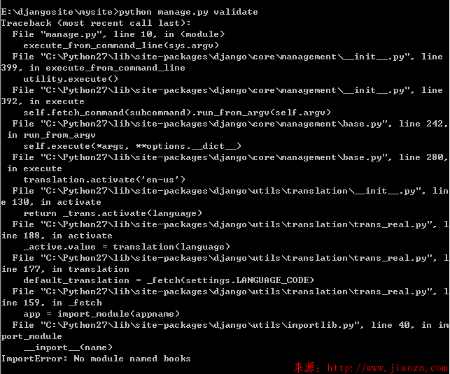 如果我将上边settings.py中INSTALLED_APPS中添加的'mysite.books'改成’books‘则会出错,原因是路径错误(这个要看你的app创建的路径)