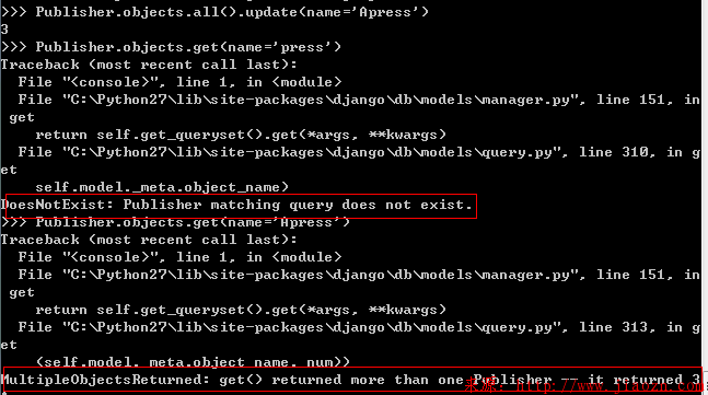 >>> Publisher.objects.get(country="U.S.A.")<Publisher: name:Apress , address: 2855 Telegraph Ave. ||>