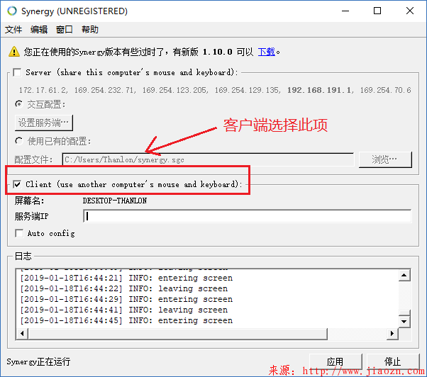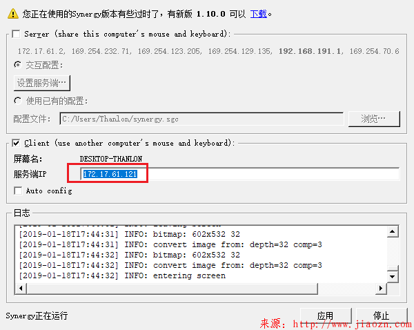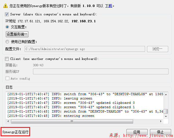 最后启动客户端,客户端正确显示“Synergy正在运行”: