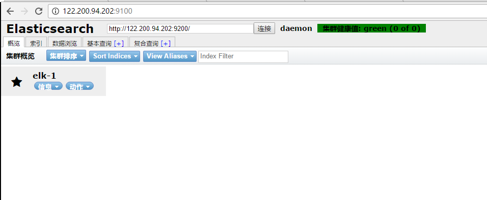 安装elasticsearch-head插件 安装docker镜像或者通过github下载elasticsearch-head项目都是可以的,1或者2两种方式选择一种安装使用即可1. 使用docker的集成好的elasticsearch-head # docker run -p 9100:9100 mobz/elasticsearch-head:5 docker容器下载成功并启动以后,运行浏览器打开http://localhost:9100/2. 使用git安装elasticsearch-head # yum install -y npm # git clone git://github.com/mobz/elasticsearch-head.git # cd elasticsearch-head # npm install # npm run start 检查端口是否起来 netstat -antp |grep 9100 浏览器访问测试是否正常 http://IP:9100/