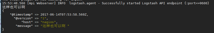 使用配置文件运行logstash# logstash -f ./elk.conf运行成功以后输入以及标准输出结果