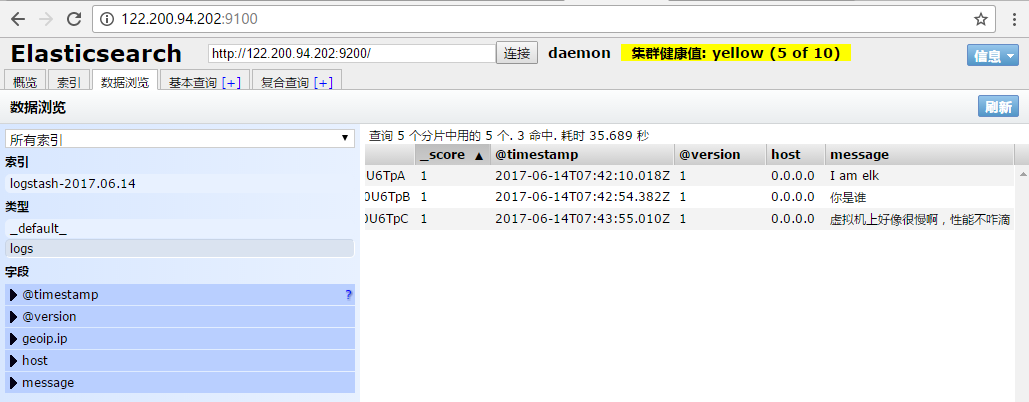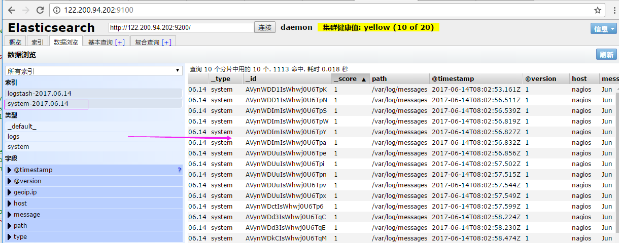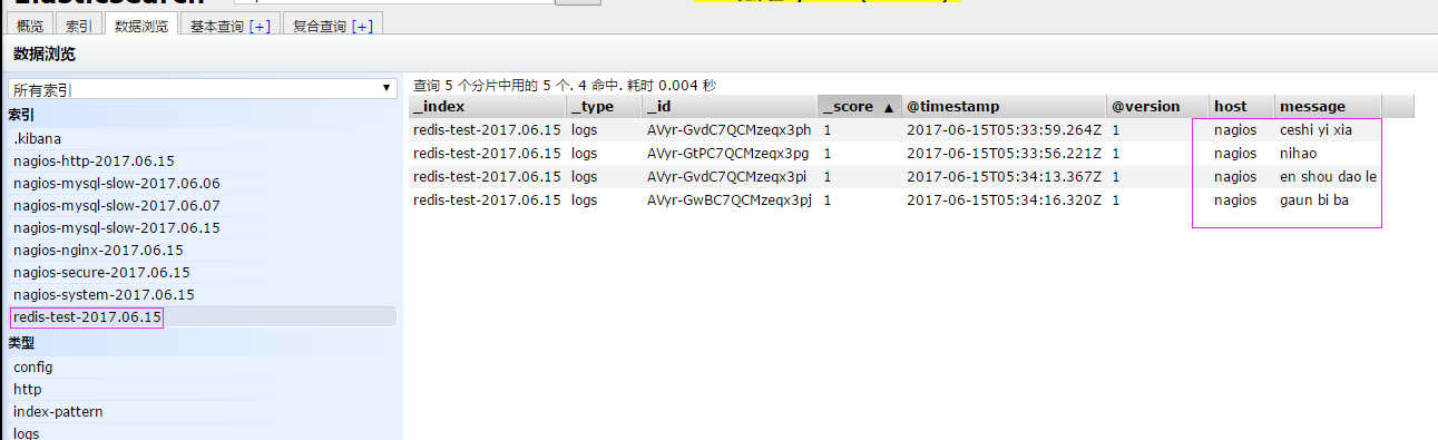 运行命令看看效果# /usr/share/logstash/bin/logstash -f /etc/logstash/conf.d/redis-out.conf效果是和直接往ES服务器输出一样的(这样是先将日志存到redis数据库,然后再从redis数据库里取出日志)