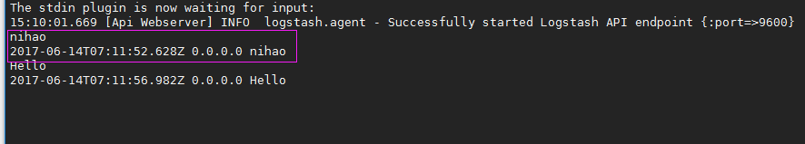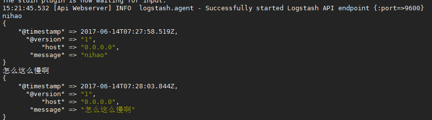运行logstash指定redis-out.conf的配置文件# /usr/share/logstash/bin/logstash -f /etc/logstash/conf.d/redis-out.conf运行成功以后,在logstash中输入内容(查看下效果)
