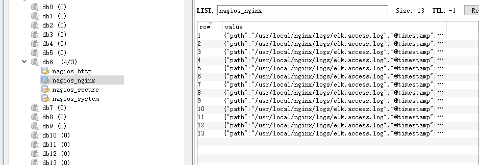 把之前的配置文件修改一下,变成所有的日志监控的来源文件都存放到redis中,然后通过redis在输出到elasticsearch中