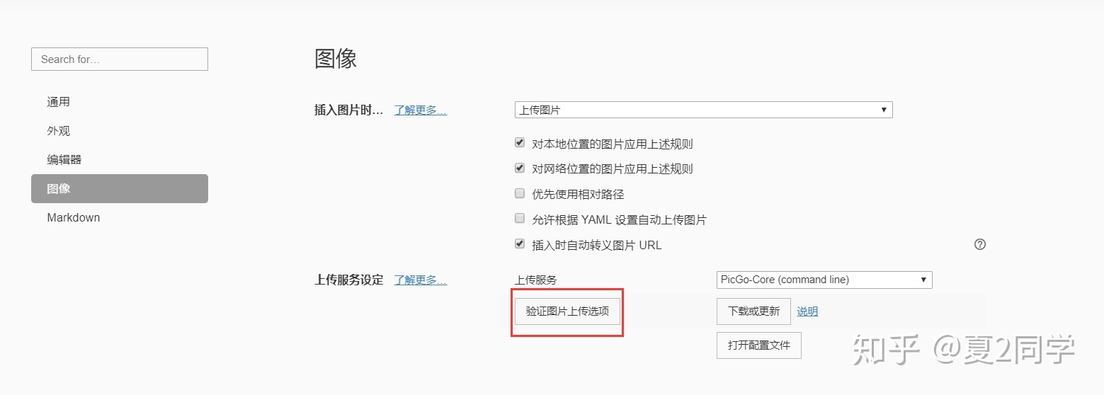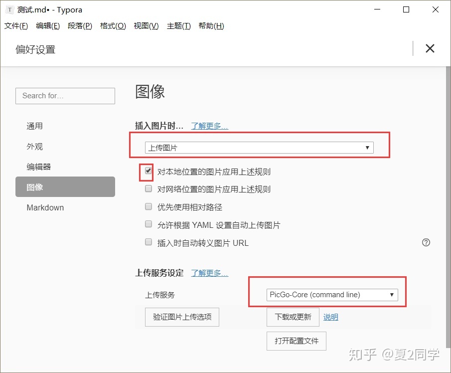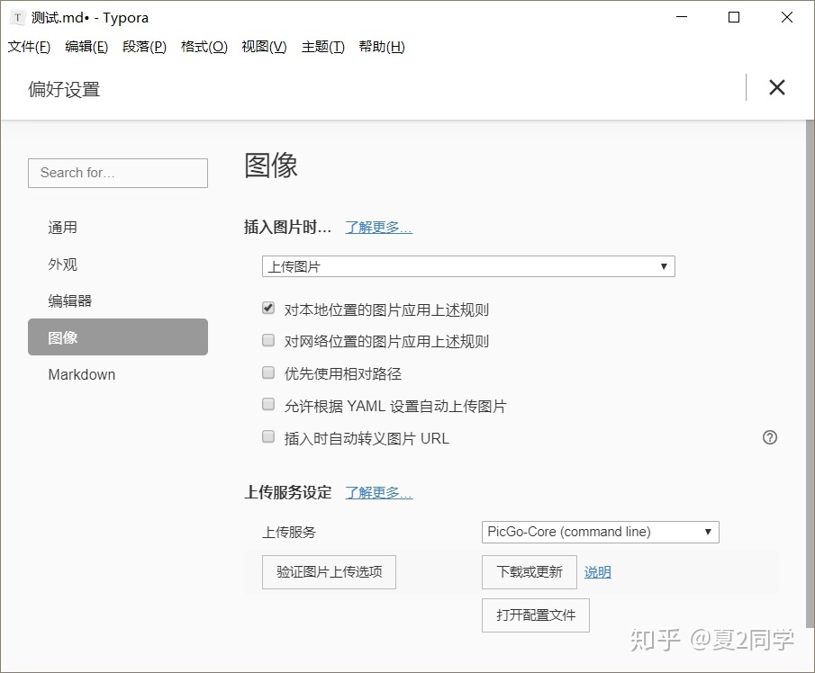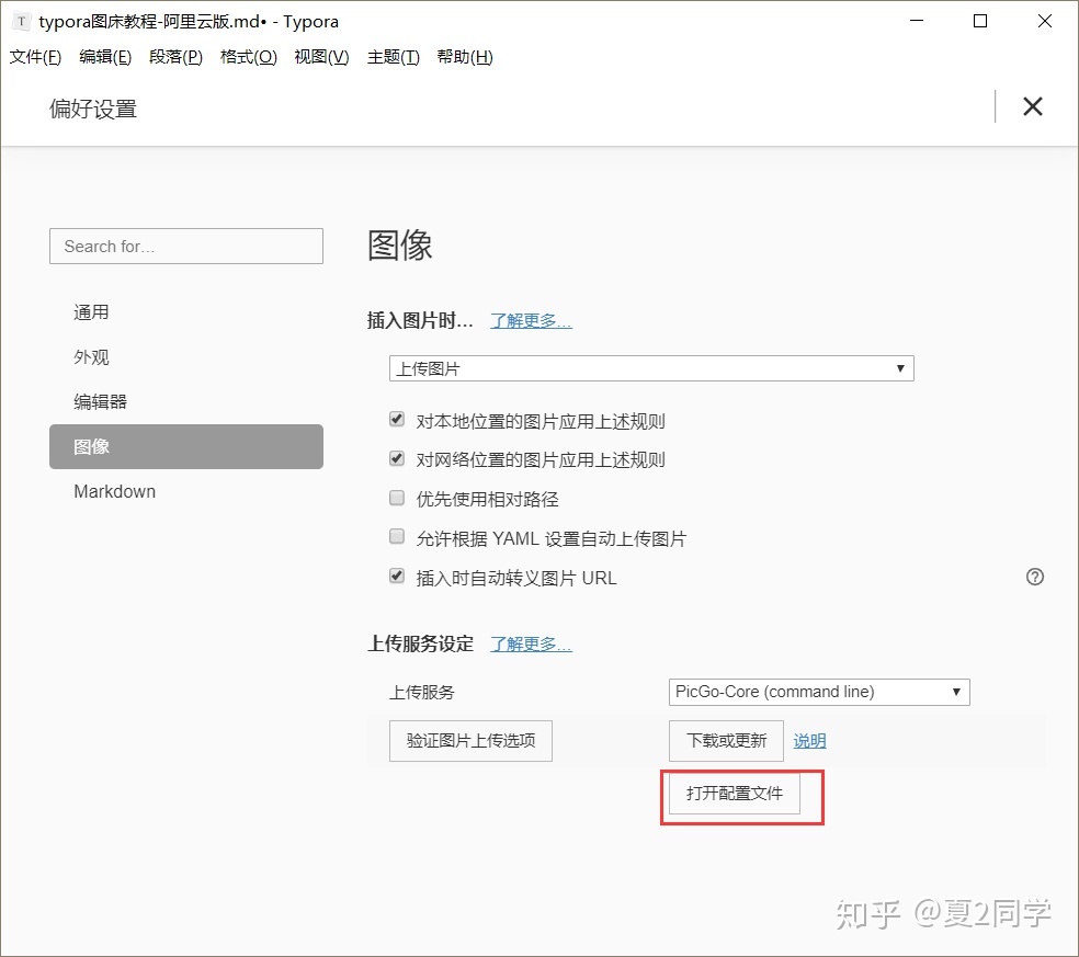 回到typora,依次 文件 ----> 偏好设置 -----> 图像,到下面的页面,选择打开配置文件。