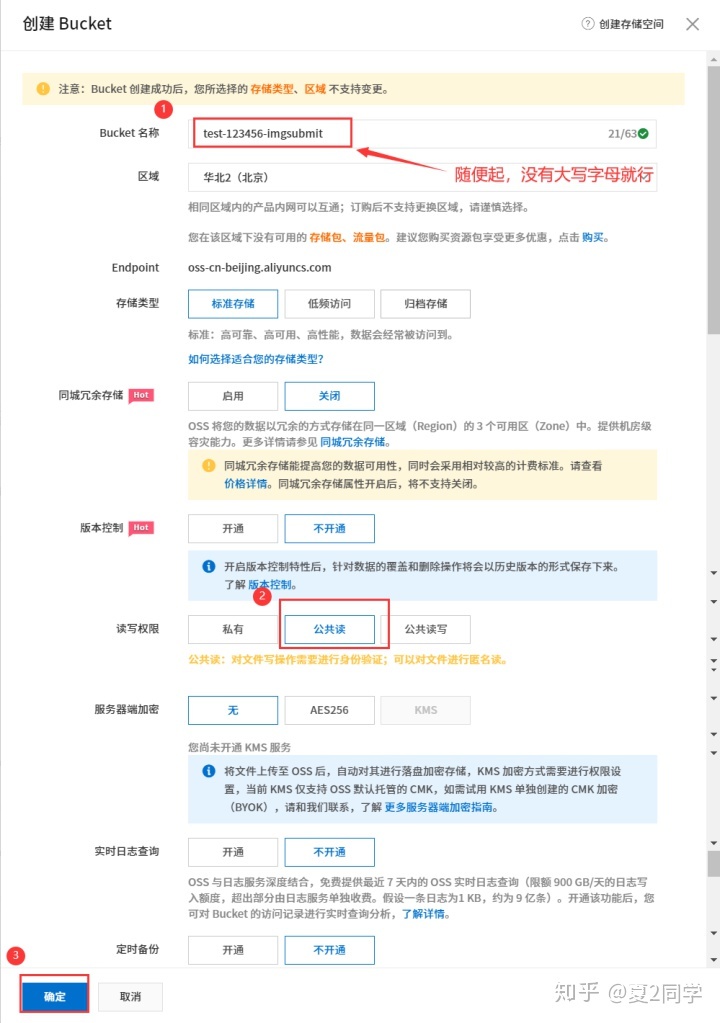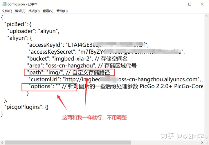 { "picBed": { "uploader": "aliyun", "aliyun": { "accessKeyId": "", "accessKeySecret": "", "bucket": "", // 存储空间名