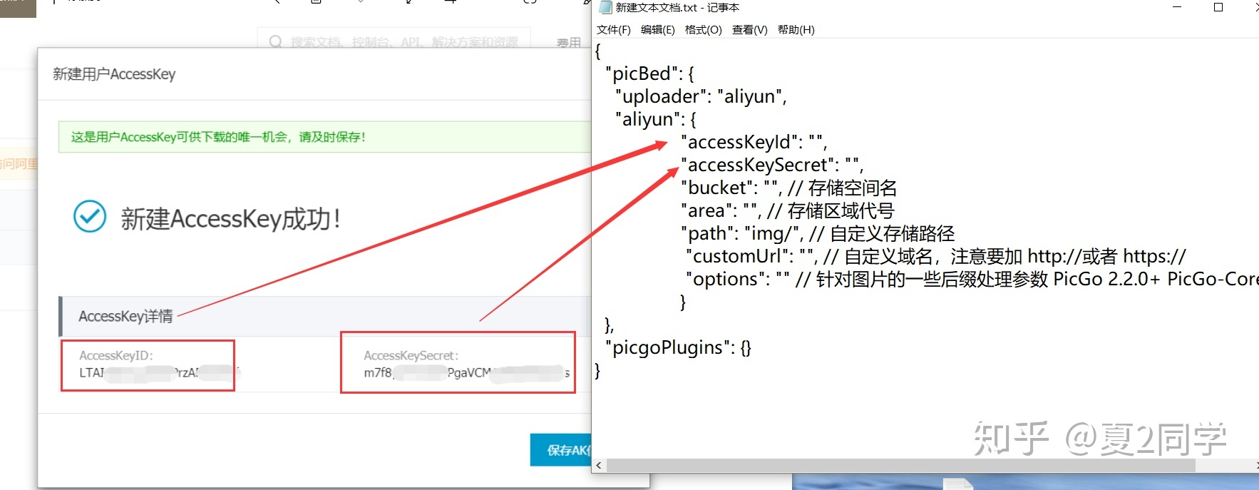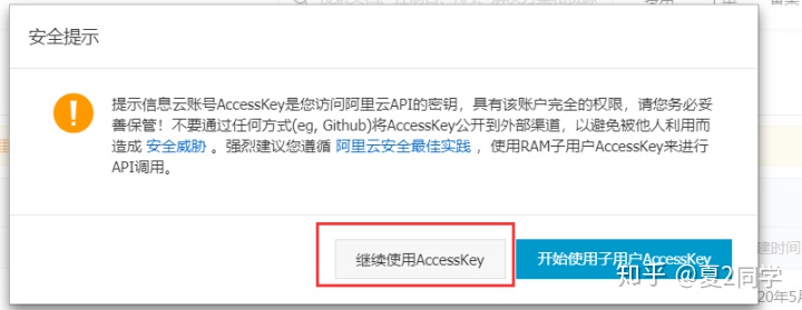 选择继续使用AccessKey,并点击创建accessKey,将新建的txt文本对应内容替换。