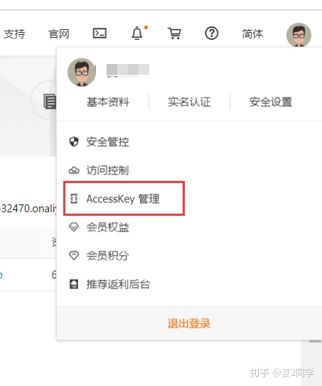 鼠标悬浮在右上角头像上,并选择AccssKey管理。