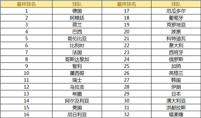 2014年07月15日 15:00:46 作者:Jiaozn 分类:自媒体 评论(0)北京时间2014年6月13日至7月14日巴西世界杯,四星德国诞生为2014世界杯画上句号,全部32支球队排名落定,德国队7战6胜1平最终夺冠,捧起大力神杯。阿根廷、荷兰、巴西分列第二至第四名。俄罗斯、加纳、英格兰、韩国、伊朗、日本、澳大利亚、洪都拉斯和喀麦隆小组赛三战未获一胜,排名第24-32位,其中澳大利亚、洪都拉斯和喀麦隆三支球队三战全负,喀麦隆因为净胜球最少(-8个)而排名最后。